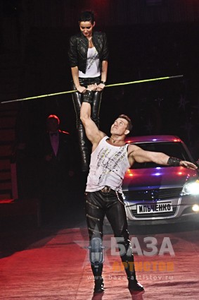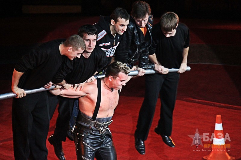 Жонглирование автомобильными колёсами и покрышками,поднятия тяжестей и людей в качестве груза при помощи разных по толщине прутьев и сгибания этих прутьев в всевозможные фигуры; живая карусель весом до 510 кг из 7 человек;работа с автомобилем-переезд,выталкивание при помощи зубов,горла и другое!!!!