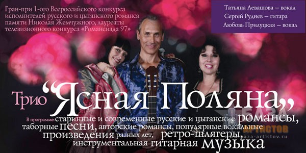 Главная отличительная черта трио "Ясная поляна" - высокий художественный и музыкальный уровень исполнения, потрясающее исполнительское мастерство и индивидуальное прочтение известных произведений.