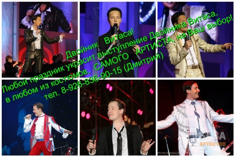 Двойник Vitasa Дмитрий Воробьев - один из самых знаменитых двойников Vitasa в мире. Единственный официально признанный двойник Витаса самим продюсером – Сергеем Пудовкиным и артистом Витасом . Дмитрий постоянно принимает участие в различных телешоу и концертах, связанных с певцом и артистом Витасом, а также устраивает благотворительные выступления! Дмитрий работает в этом жанре уже 7 лет. У Дмитрия естественная схожесть с артистом, ведь он не сделал ни одной пластической операции! К своей природной схожести на Витаса, Дмитрий добавляет профессиональный грим и неповторимую мимику, что делает его просто копией певца и артиста! Двойник Витаса! Выступает в подаренных звездой российской эстрады костюмах, а так же имеет разрешение Пудовкина С.Н. (продюсера артиста) и самого певца на пародийные выступления. Вашему восторгу от сходства двойника с оригиналом не будет предела.